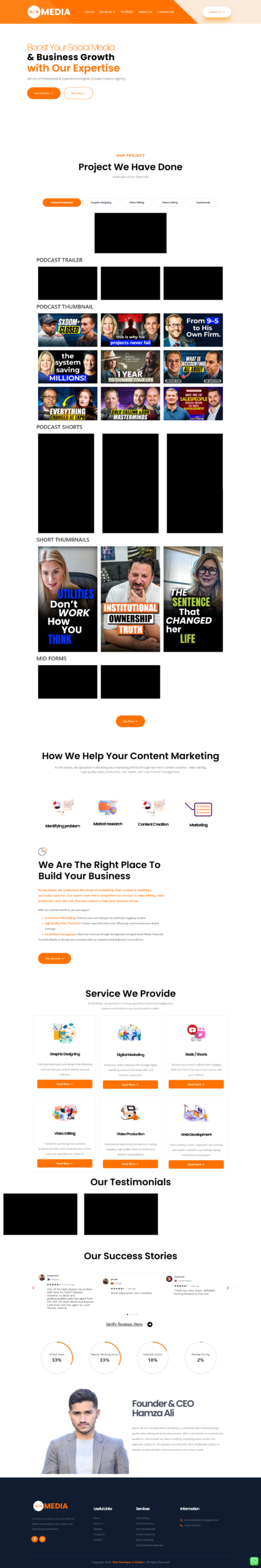 Driving Business Growth Through Powerful Content We developed a visually engaging and strategically structured website that positions AHS Media as a reliable growth partner for brands and creators. The layout emphasizes portfolio visibility, service clarity, and strong calls to action such as “Hire Now” and “See Portfolio,” ensuring visitors quickly understand the value offered.