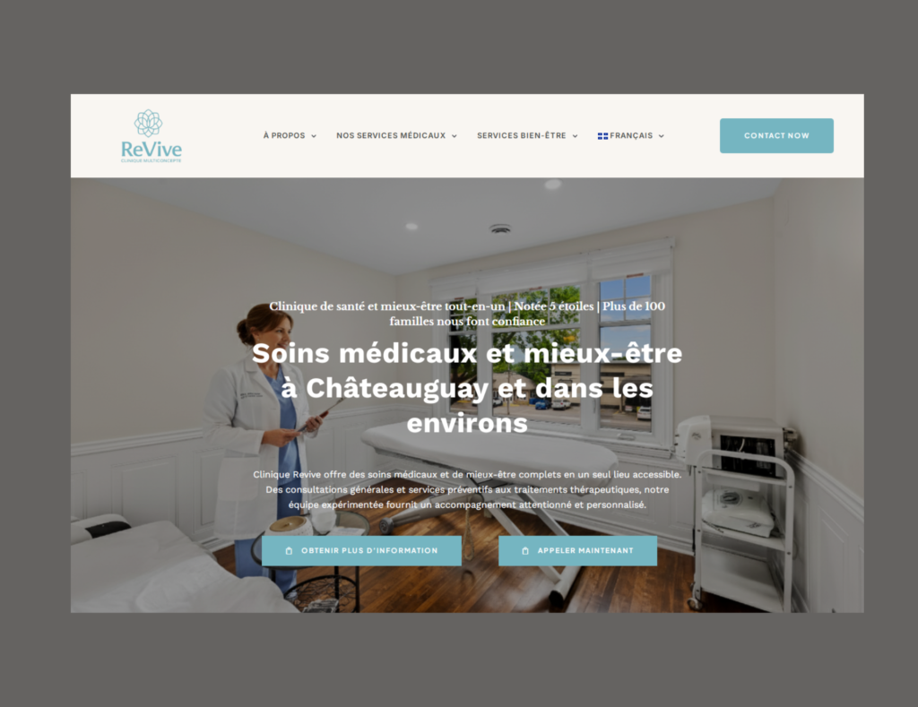 Clinique Revive is a premium private medical and wellness clinic in Châteauguay. NextDigitalz built a sophisticated, bilingual (English/French) platform designed to communicate a full range of services—from doctor consultations and lab work to therapeutic treatments—while enabling seamless online appointment bookings. The site integrates WooCommerce for service pricing and bookings, Elementor Pro for a professional design, and Rank Math to drive local SEO visibility.