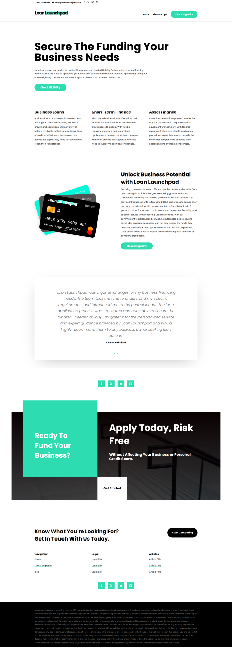 Loan Launchpad is a finance website designed to help UK-based Limited Companies and LLPs secure business funding quickly and efficiently. The website offers a variety of loan options, including short-term finance, asset finance, and term loans, while providing a fast, user-friendly eligibility checking system without affecting credit scores. The project aimed to build a credible, professional online platform that communicates trust, efficiency, and financial expertise.
