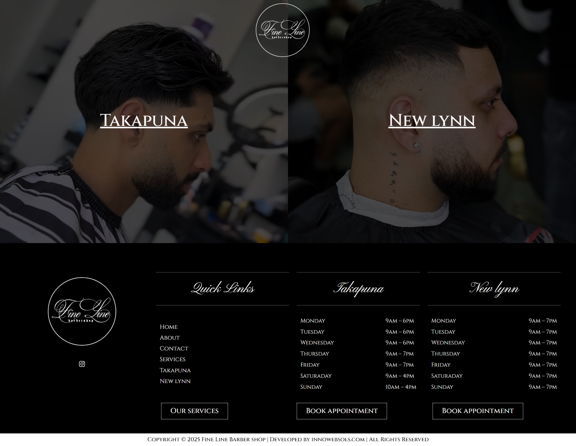 Fine Line Barber Shop is a modern grooming website designed for a premium barber brand with multiple locations in Takapuna and New Lynn. The objective of this project was to create a clean, easy-to-navigate online presence that clearly displays services, business hours, and booking options while maintaining a stylish and professional brand image.