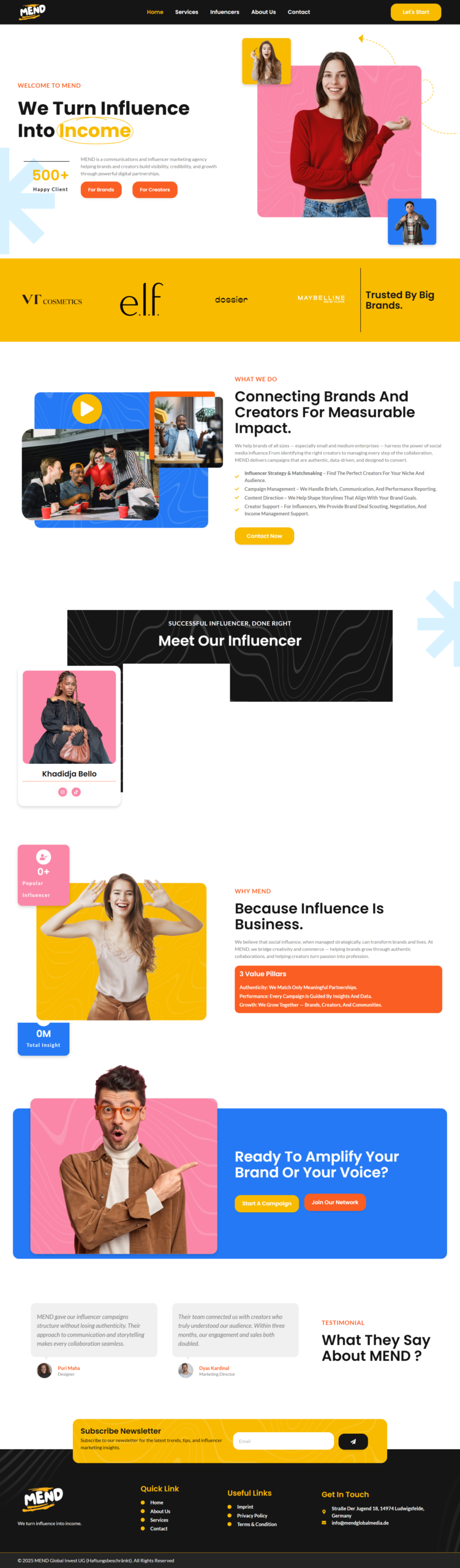 MEND is a strategic communications and influencer marketing agency that helps brands and creators build visibility, credibility, and measurable growth through powerful digital partnerships. With a strong focus on authenticity and performance, we transform influence into real business results.